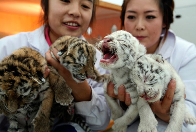 22. Работники демонстрируют четырех сибирских тигрят, недавно родившихся в зоопарке Далиана, провинция Ляонин. (REUTERS)