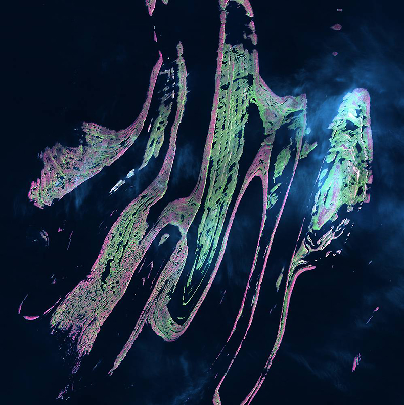 3. Словно широкие мазки розовой и зеленой краски, острова Белчер пересекают глубокий голубой Гудзонов залив в Канаде. Немногочисленные жители островов сосредоточены в небольшом городке Саникилиуак, недалеко от верхнего края среднего острова. Несмотря на зеленые оттенки на этом цветокодированном снимке, на этих островах слишком холодно, чтобы там росла какая-нибудь сколь заметная растительность. (USGS and NASA)