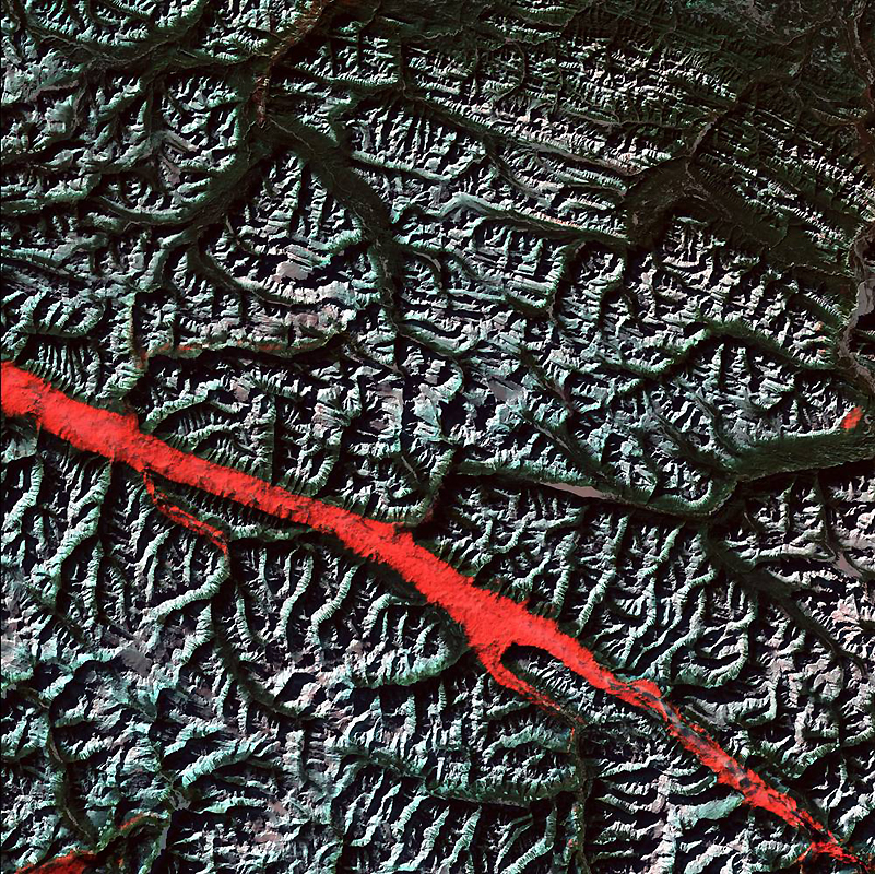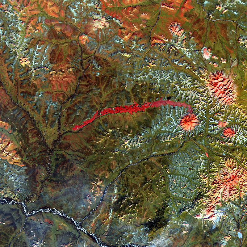 2. Выпуклая красная полоска в центре этого снимка представляет собой останки лавы и оползня. Их источником является ныне спящий Анюйский вулкан на северо-востоке России (на фото представлен в виде оранжевого круга справа от полосы). Отдаленный и практически недоступный регион представляет собой сосредоточение вулканов, пологих долин и нетронутых человеком рек и ручьев, подпитываемых талыми снегами. (USGS and NASA)
