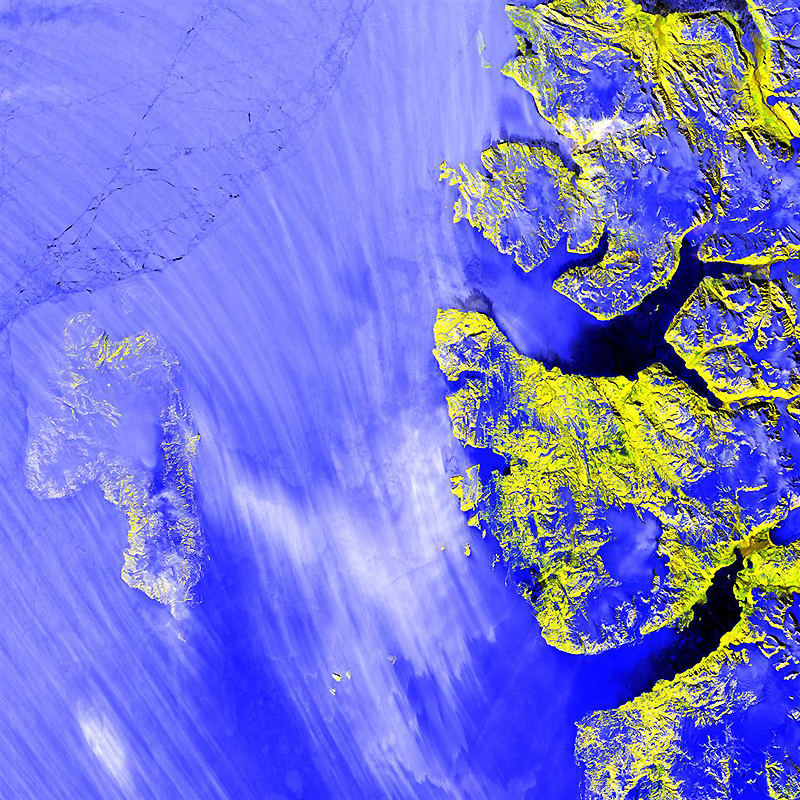 11. На этом снимке Landsat дымка снега практически закрыла остров Мейген (слева) у северного побережья Канады. Через канал Свердрап лежит более крупный остров Алекса Хайберга, где ледники (голубые) столпились среди горных вершин (желтые) и врезаются глубоко во фьорды. На острове Мейген так и не были найдены доказательства человеческой жизни. (USGS and NASA)