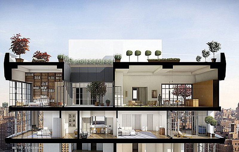 2. Этот разрез демонстрирует два самых верхних этажа и сад, который находится на крыше. Система "небесный гараж" новинка даже для Нью-Йорка, и этот дом – первый, где применили эту технологию. Собственно сами гаражи находятся в специальной башне, где предусмотрена система аварийных выходов и очень мощная вентиляция. Площадь гаража, которым пользуется Николь Кидман составляет 32,5 кв. м., а попасть в него из ее квартиры можно через кухню. Чтобы машина очутилась в "своей квартире" водитель должен подъехать к задней части здания и загнать машину в специальный лифт, обслуживающий гараж. На этом лифте автомобиль поднимается на нужный этаж и просто въезжает в гараж. Чтобы выехать на улицу, нужно проделать все то же самое, только в обратном порядке. При этом из дома машина заезжает в лифт задним ходом.